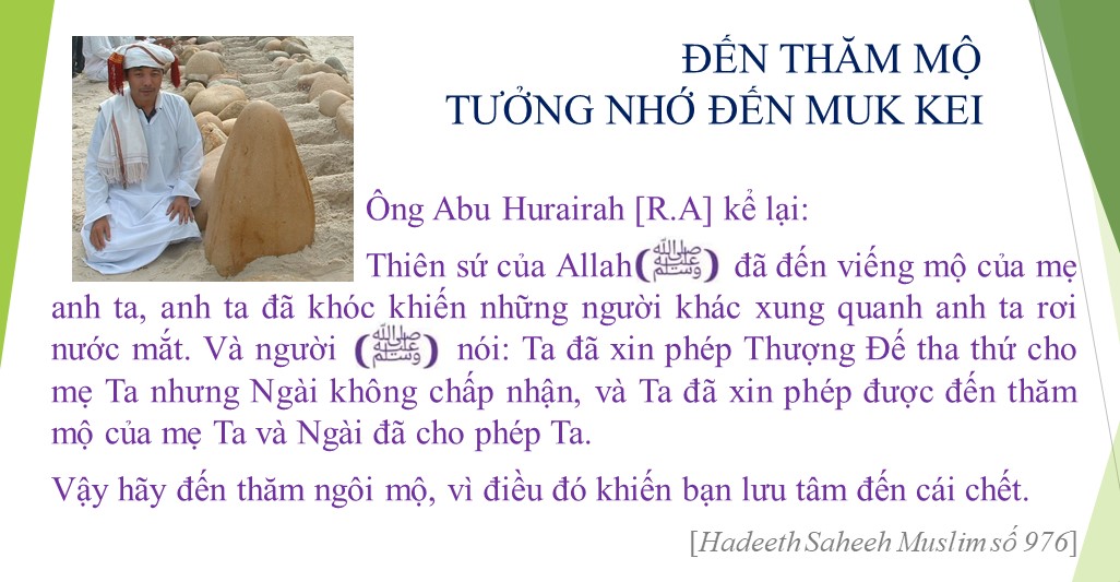 Nabi Islam nói, tất cả các người sao khi chết thì các người sẽ được trình bày xem nơi ở của các người vào những ngày tới. Khi con người cận kề với cái chết có thể được chia thành ba nhóm, nhóm thứ nhất sẽ được ở cận kề Po Allah, nhóm này sẽ được bình yên và Thiên đàng hạnh phúc chào đón được các Thiên thần (Malaikah) đến trấn an họ vì những người sắp chết hay hấp hối thì rất sợ bởi khi nhắm mắt họ chưa thấy cảnh tưởng đó bao giờ, khi nhắm mắt tức là xong cuộc đời ở trần gian (Dun-ya), nên các Malaikah đến trấn an, khuyên cứ rời khỏi thể xác và được Malaikah nâng niu và chiều chuộng. Nhóm thứ hai là những người đứng bên tay phải thuộc nhóm người được bình an nhưng không chào đón bằng nhóm người thứ nhất. Nhóm người thứ ba thuộc nhóm người bên tay trái là những người phủ nhận chân lý Hồi giáo thì họ phải đối diện với sự hình phạt ở nơi cõi mộ