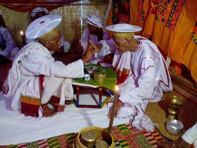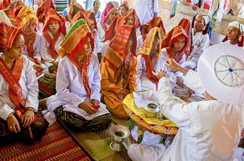 Hình 11. Lễ phong chức Gru (Sư cả) của Agama Awal (Hồi giáo). Cả hai Gru cùng trỏ tay thề và đọc Shahadah chỉ duy nhất tôn thờ Thượng đế Allah và tôn kính Nabi Muhammad.