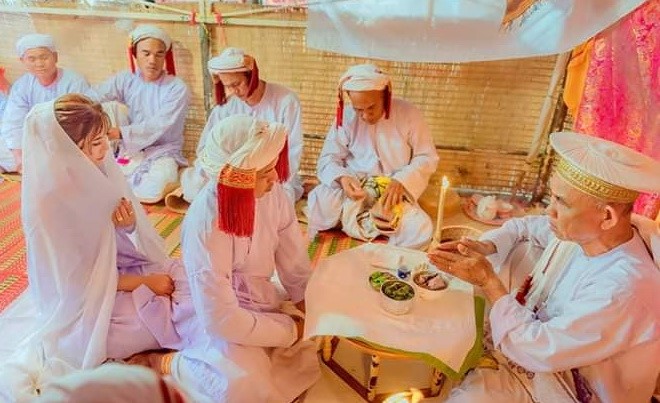 Hình 9. Po Gru làm lễ tục trong Lakhah Chăm theo Awal. Đọc Shahadah thề chỉ tôn thờ Thượng đế Allah và tôn kính Thiên sứ Muhammad trong lễ cưới.