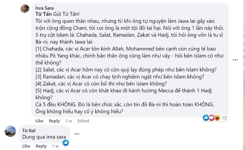 Tôi với ông quen thân nhau, nhưng từ khi ông tự nguyện làm Jawa lai gây xáo trộn cộng đồng Cham, tôi coi ông là một tội đồ tai hại. Nói với ông 1 lần này thôi.