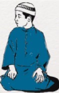 Bước 5: Ngồi dậy thẳng lưng và nói “Allahu Akbar” khi ngồi mông đặt trên lòng bàn chân trái, bàn chân phải dựng đứng lên hoặc để xuôi ra phía sau, hai bàn tay khép lại đặt trên đầu gối, mắt nhìn xuống nơi quỳ lạy và nói (1 lần):