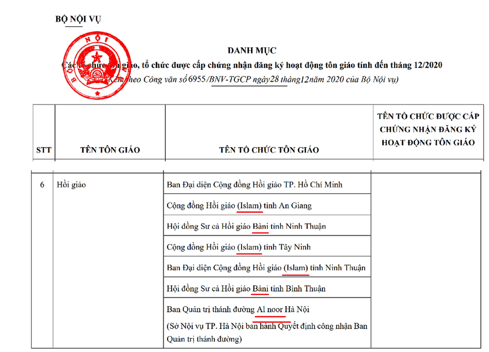 Hình 3. Theo Công văn số: 6955/BNV-TGCP ngày 28 tháng 12 năm 2020 của Bộ Nội vụ, số thứ tự (6) là tôn giáo Hồi giáo, gồm có 7 tổ chức tôn giáo.