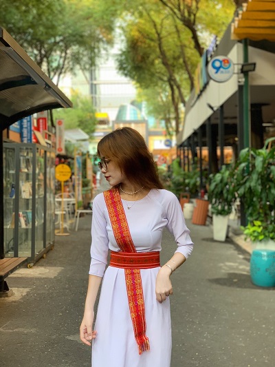 Trang phục phụ nữ Chăm là sự kết hợp hài hòa của nhiều yếu tố, từ những tua sợi vải màu đỏ làm đẹp cho đôi tai, những dây thắt lưng rực rỡ hoa văn giúp những đường cong thiếu nữ thêm duyên dáng, gợi cảm.
