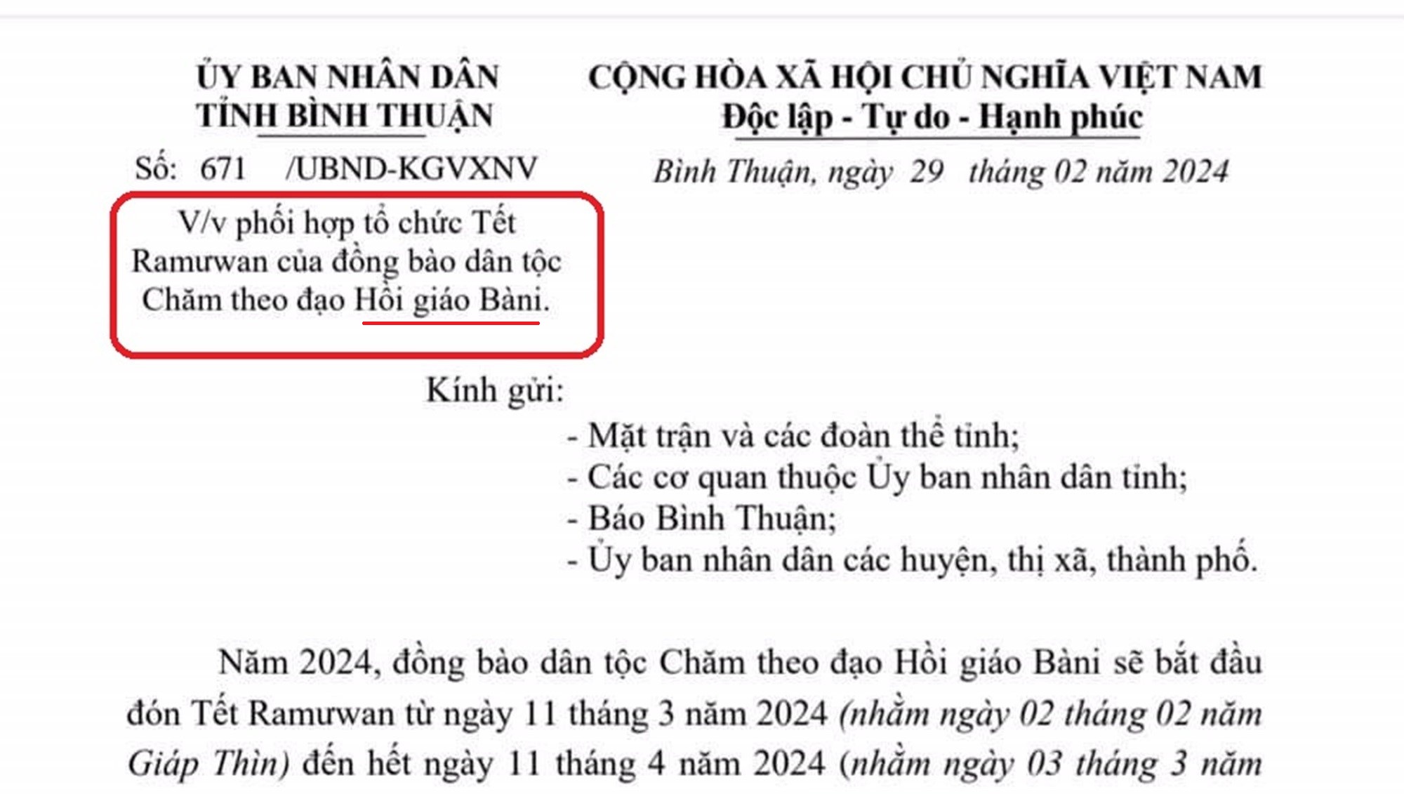 b).Trong văn bản số 671/UBND-KGVXNV, ngày 29/2//2024, về việc phối hợp tổ chức tết Ramưwan của đồng bào dân tộc Chăm theo đạo Hồi giáo Bàni.