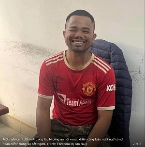 Một nghi can tươi cười trong lúc bị công an hỏi cung, khiến công luận nghi ngờ có sự “đạo diễn” trong vụ bắt người. (Hình: Facebook Bị cạo râu)
