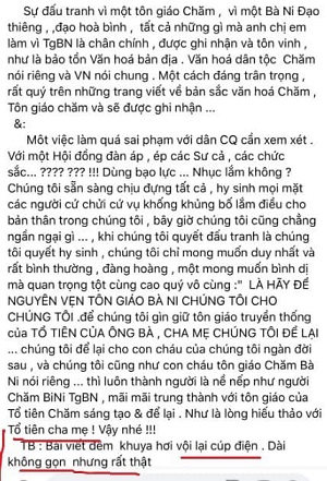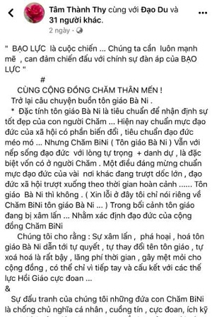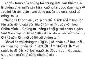 Bài viết của bà Tâm Thành Thành Thi mang tính khiêu khích tổ chức biểu tình phục vụ cho hoạt động thành lập “Nhà nước Bàni”. Tôi không hiểu tại sao chính quyền địa phương cứ để bà ta liên tục làm những việc này.