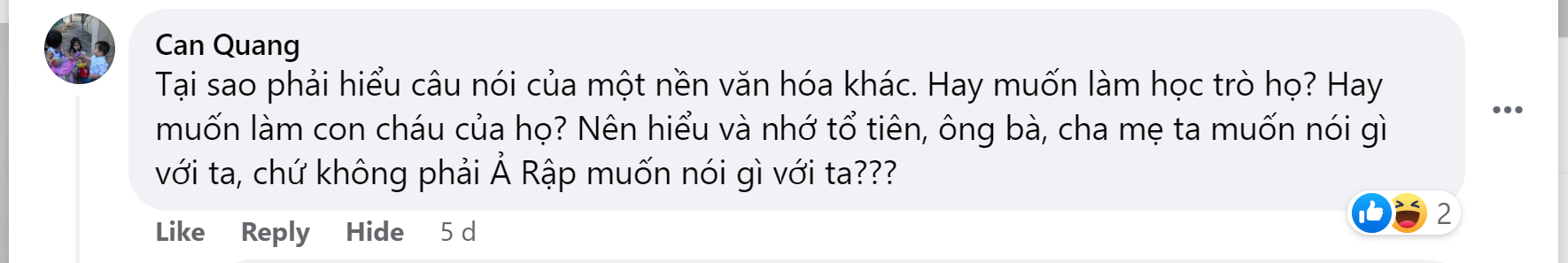 "Tại sao phải hiểu câu nói của một nền văn hóa khác. Hay muốn làm học trò họ? Hay muốn làm con cháu của họ? Nên hiểu và nhớ tổ tiên, ông bà, cha mẹ ta muốn nói gì với ta, chứ không phải Ả Rập muốn nói gì với ta???"