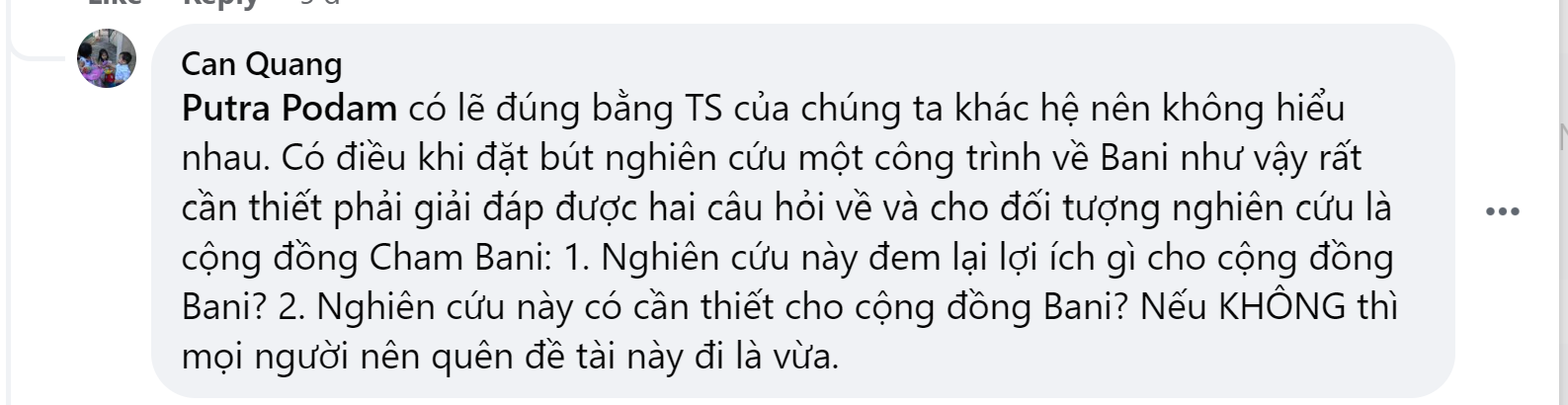 Cận Quang: "Putra Podam, có lẽ đúng bằng TS của chúng ta khác hệ nên không hiểu nhau. Có điều khi đặt bút nghiên cứu một công trình về Bani như vậy rất cần thiết phải giải đáp được hai câu hỏi về và cho đối tượng nghiên cứu là cộng đồng Cham Bani: 1. Nghiên cứu này đem lại lợi ích gì cho cộng đồng Bani? 2. Nghiên cứu này có cần thiết cho cộng đồng Bani? Nếu KHÔNG thì mọi người nên quên đề tài này đi là vừa".