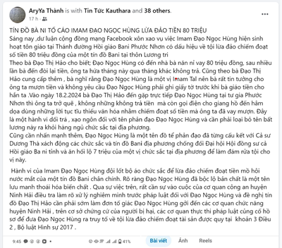 Theo thông tin đăng trên Facebook của Nhung Ngọc, Facebook AryYa Thành và bà Đạo Thị Hảo cho biết, Imam Đạo Ngọc Hùng đã lừa đảo với số tiền 80 triệu đồng.