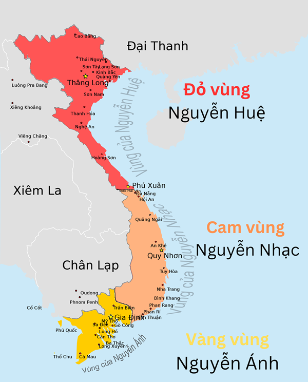 Hình 5. Lược đồ vùng kiểm soát của Nguyễn Ánh (màu Vàng) và Tây Sơn (màu Đỏ - màu Cam) khoảng năm 1788. Ảnh Iternet.