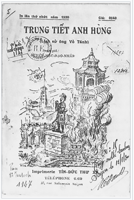 Hình 6. Bìa sách Trung tiết anh hùng: Lịch sử ông Võ Tánh (1930) của tác giả Huyền Mặc đạo nhân miêu tả cảnh Võ Tánh tự sát cuối cuộc bao vây thành Quy Nhơn sau một thời gian cầm chân đại quân Tây Sơn tại đây.