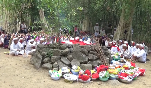 Hình 8. Chức sắc Acar (Hồi giáo dòng Awal) đang Kamruai (Gahul là patau nisan, bia đá) đọc Thiên kinh Koran như Al-Fatihah, Ayat Kusi (Auwa), Ash-shams, Yasin và một số Du-a khác.