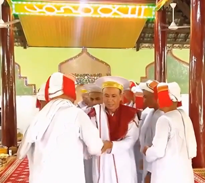 Hình 12. Giáo sĩ (Acar) tôn giáo: Awal (Hồi giáo Awal) đang thực hiện Jabat Salam. Trong Akayet Inra Patra, câu 519 có ghi: Dom nan anâk patao pak pluh, jabat sulam blaoh kakuh, tadhuw ka Po Inra Patra.