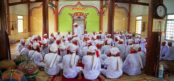 Hình 13. Giáo sĩ (Acar) tôn giáo: Awal (Hồi giáo Awal) đang thực hiện Jabat Salam. Trong Akayet Inra Patra, câu 519 có ghi: Dom nan anâk patao pak pluh, jabat sulam blaoh kakuh, tadhuw ka Po Inra Patra.