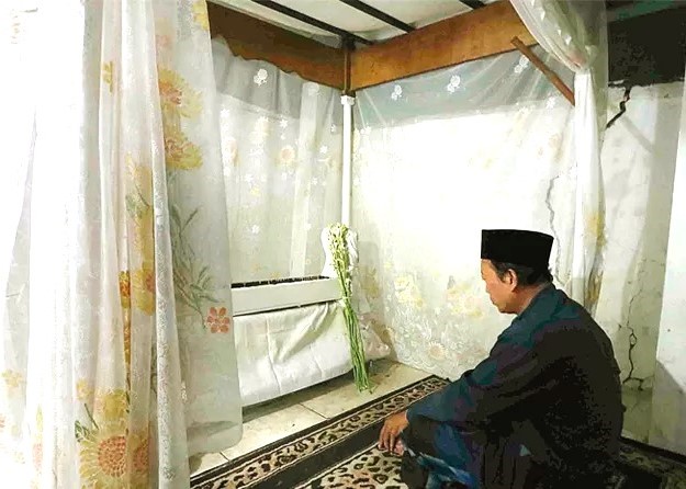 Hình 50. Ahmad Saifuddin cầu nguyện tại lăng mộ Putri Cempo (công chúa Champa). Ahmad là thế hệ thứ năm trong coi khu lăng mộ. (Guslan Gumilang/Java Pos)