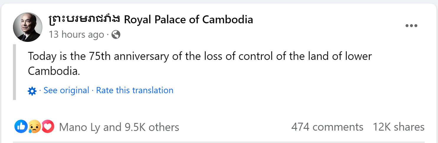 Ngày 4 tháng 6 năm 2024, Đức Vua Norodom Sihamoni phát thông điệp nhân diệp kỷ niêm 75 năm ngày Pháp giao Cochinchine (Kampuchea-Krom) cho Việt Nam - 4 tháng 6, 1949.