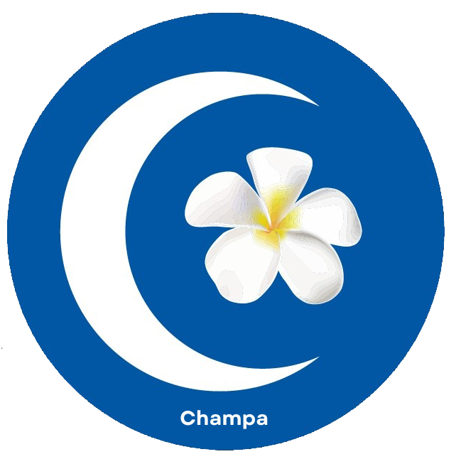 Hình 1. Hiệu huy Champa (Bani Champa), có một hình tròn nền xanh da trời tượng trưng cho sự thống nhất của nhân dân Champa, bên trong chứa trăng lưỡi liềm (Aia Bulan) và hoa Champa là ngôi sao 5 cánh (Batuk). Ngôi sao 5 cánh đại diện cho sự thống nhất giữa các tiểu bang như Indrapura, Amaravati, Vijaya, Kauthara và Panduranga. Trăng Liềm đại diện cho Hồi giáo là quốc giáo của Champa. Hoa Champa (ngôi sao 5 cánh) và trăng liềm trước đó màu vàng là màu hoàng gia Champa. Champa không còn vương nên đổi thành màu trắng, nhưng nhụy hoa Champa mãi màu vàng hoàng gia Champa. Ảnh: Putra Podam.