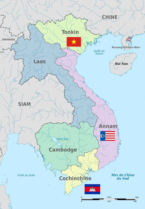 Hình 15. Bản đồ năm 1883, Việt Nam trở thành xứ thuộc địa thuộc Pháp, bị chia cắt ra làm ba kỳ: Bắc Kỳ (Tonkin), Trung Kỳ (Annam), Nam Kỳ (Cochinchine).