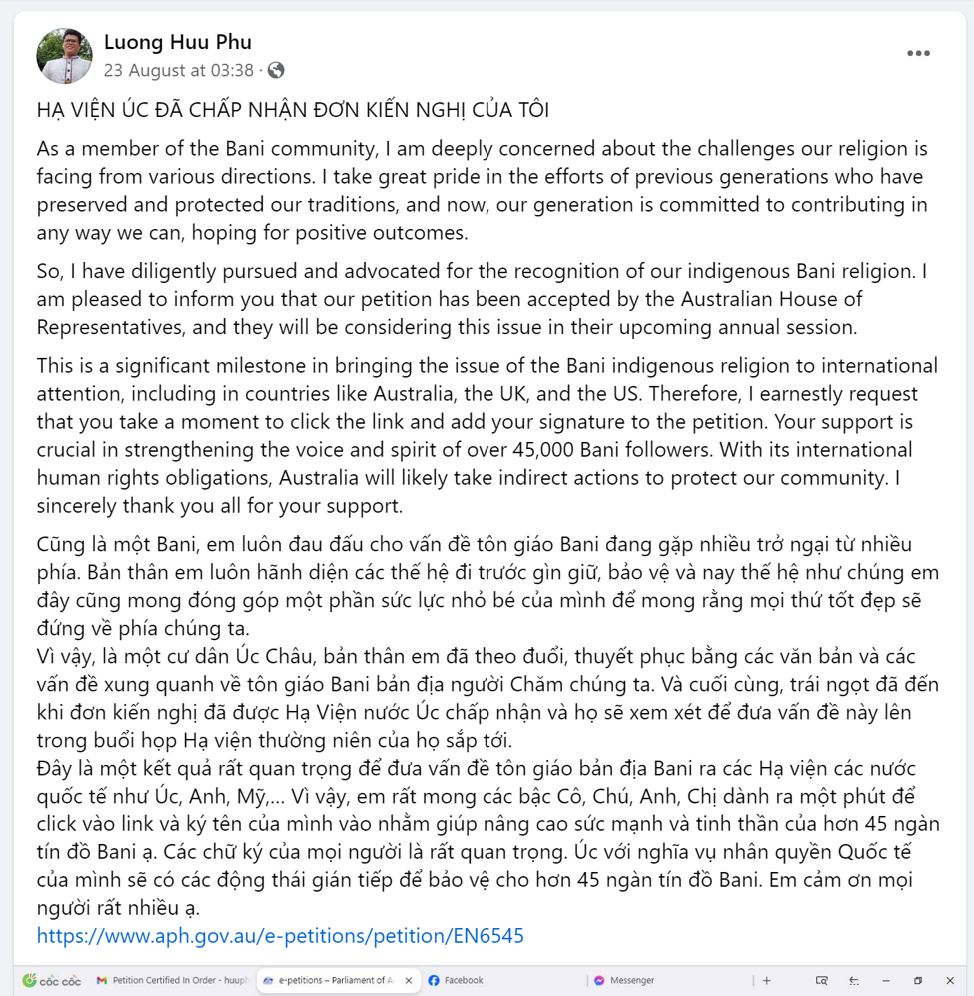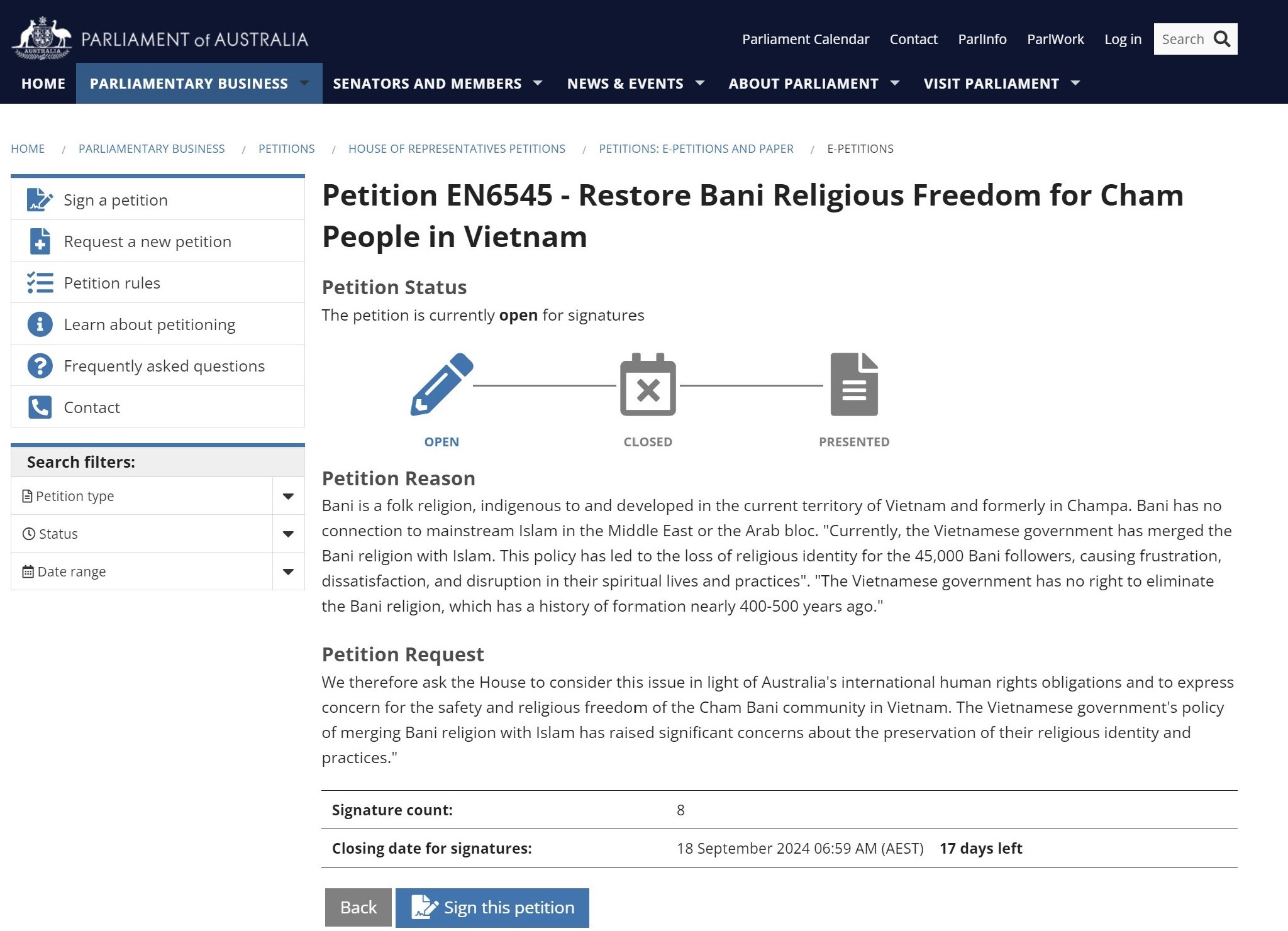 Hình 4. Bản kiến nghị “Petition EN6545 - Restore Bani Religious Freedom for Cham People in Vietnam” Hạ Viện Úc đã nhận.