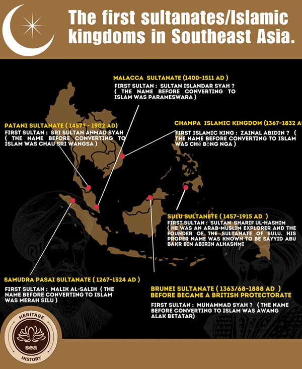 Hình 1. Các Vương quốc Hồi giáo (Vương quốc Hồi giáo đầu tiên ở Đông Nam Á) dựa trên bằng chứng lịch sử, không phải truyền thuyết. (The first Sultanates / Islamic Kingdoms in Southeast Asia - based on historical evidence, not legend.). Nguồn: SEA Heritage & History (Di sản và lịch sử Đông Nam Á).