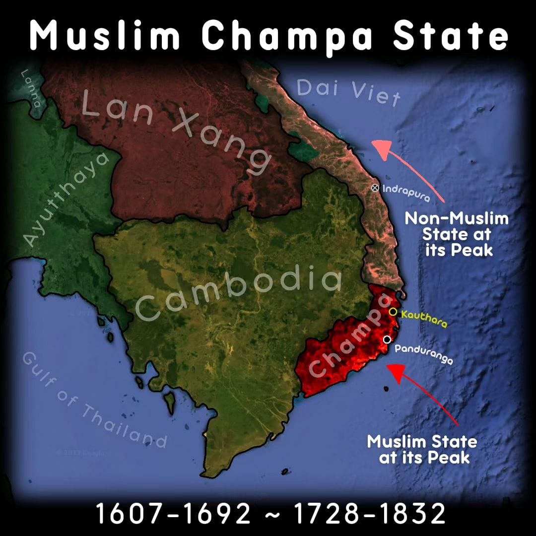 Hình 4. Năm 1000, đánh dấu sự nhường bước đầu tiên của Champa trước sức ép của dân tộc Việt, tức là một sự thoái lui dần về phương nam, hơn 400 năm (1000-1471) thủ đô Vijaya tồn tại và cáo chung, và hơn 800 năm (1000-1832) vương quốc Champa cáo chung. Triều đại Vijaya chính thức cáo chung, Champa tan rã và lui dần về phía nam. Tướng Bố Trì Trì (vị tướng Champa theo Islam) chạy vào phía nam chiếm vùng Panduranga (sách sử Việt gọi là Phan Lung) xưng làm vua Champa. Panduranga hoàn toàn Islam là Quốc giáo từ thế kỷ 15 (1471) cho đến thế kỷ 19 (1832). Nguồn ảnh: SEA Heritage & History (Di sản và lịch sử Đông Nam Á).
