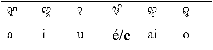 Nhóm nguyên âm trong chữ viết Akhar Thrah Cham gồm 6 ký tự như Bảng 1 dưới đây:
