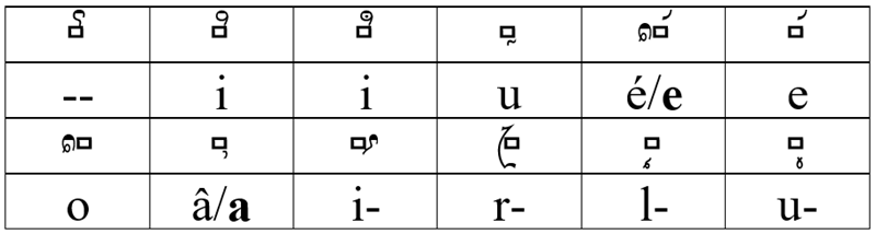 Tham khảo 2. Bảng tham khảo nhóm nguyên âm chữ viết Akhar Thrah Cham.