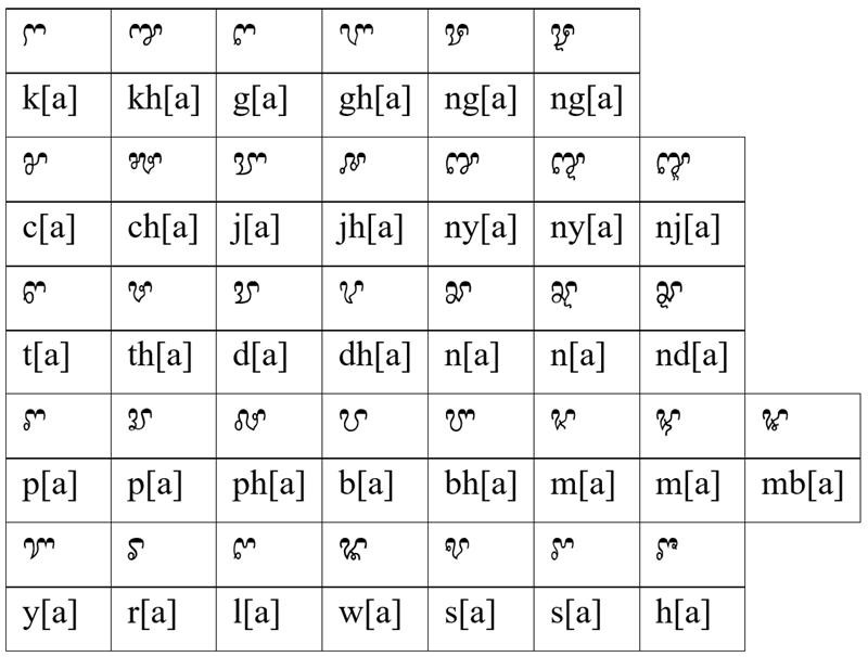Nhóm phụ âm Akhar Thrah Cham gồm 35 ký tự, mỗi phụ âm đều mang âm /a/ và được liệt kê theo trình tự như Bảng 2 dưới đây: