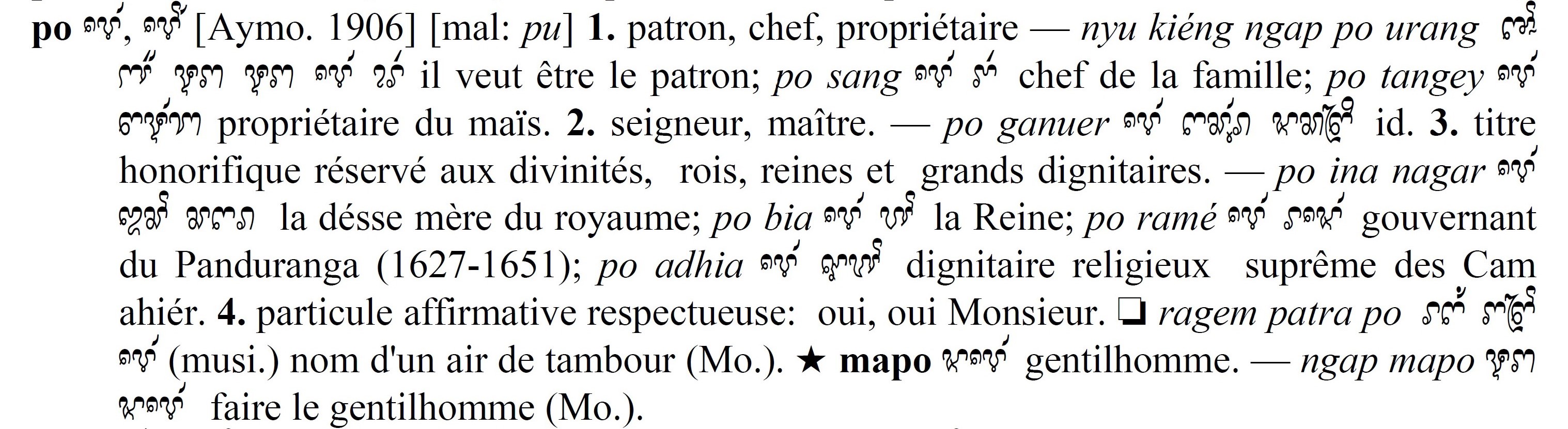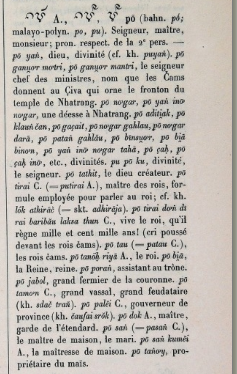Hình 2. Từ “Po” trong tự điển Cabaton, Antoine; Aymonier, Etienne 1906 [accessed: 2024/9/28]. "références bibliographiques" (Object Id: 10661). In Dictionnaire Cam-Français, E. Aymonier et A. Cabaton. ODSAS: https://www.odsas.net/object/10661.