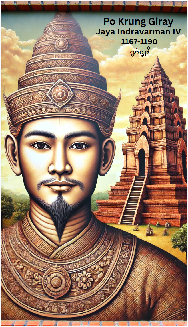 Hình 5. Vua Jaya Indravarman IV (1167-1190). Tên húy: Po Kurung Garay, Po Krung Giray, Po Klau Girai, Po Klong Garai, Po Klaong Garai. Tên hiệu: Sri Jaya Indravarmadeva. Vị vua Champa (Raja-di-raja) đóng đô tại Vijaya, vua ảnh hưởng Islam (Hồi giáo) thuộc sắc tộc Jarai (Jrai). Các con ông gồm công chúa Bhagyavati, công chúa Sumitra, công chúa Sudaksina.