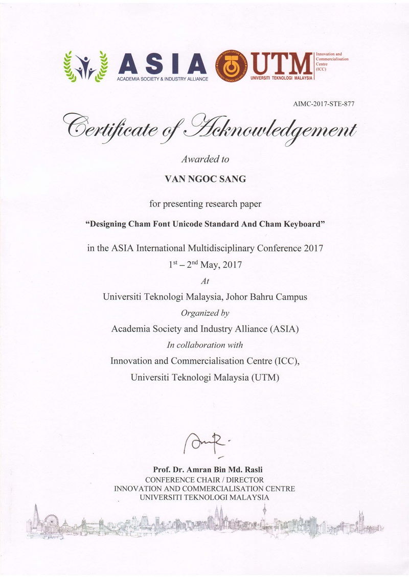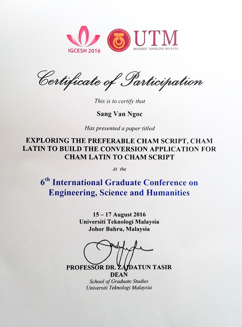 Van Ngoc Sang, Mohamad Bin Bilal Ali, Noor Dayana Abd Halim. “Exploring The Preferable Cham Script To Build The Conversion Application For Cham Latin To Cham Script”. The 6th International Graduate Conference on Engineering Science & Humanity 2016 (IGCESH 2016). Malaysia on 15 - 17 August 2016. Proceedings Empowering Innovation and Entrepreneurship for Sustainable Development. Volume I, 619-622 August 2016. ISBN 978-967-0194-67-7. Published by School of Graduate Studies, Universiti Teknologi Malaysia.