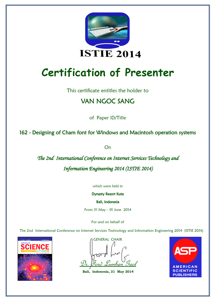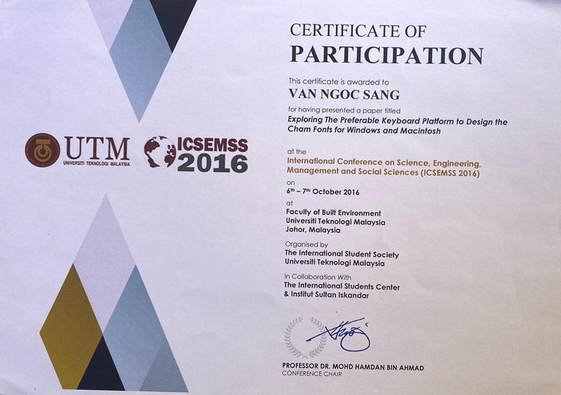 Van Ngoc Sang, Mohamad Bin Bilal Ali. "Designing of Cham font for Windows and Macintosh operation systems". The 2nd International Conference on Internet Services Technology and Information Engineering 2014 (ISTIE 2014). Indonesia, 31 May - 01 June, 2014.