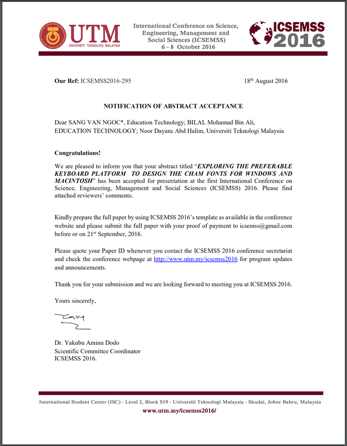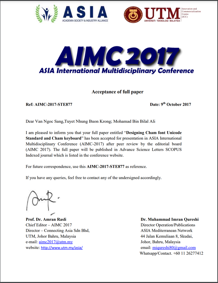 Acceptance letterI (IGCESH2016 ID188): Exploring The Preferable Cham Script To Build Conversion Application For Cham Latin To Cham Script