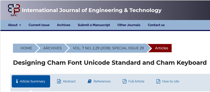 Tuyet Nhung Buon Krong, Van Ngoc Sang, Mohamad Bin Bilal Ali. “Designing Cham Font Unicode Standard and Cham Keyboard”. International Journal of Engineering & Technology, 7 (2.29) (2018) 853-857. DOI: 10.14419/ijet.v7i2.29.14271. Science Publishing Corporation (SPC). Jordan, Amman.
