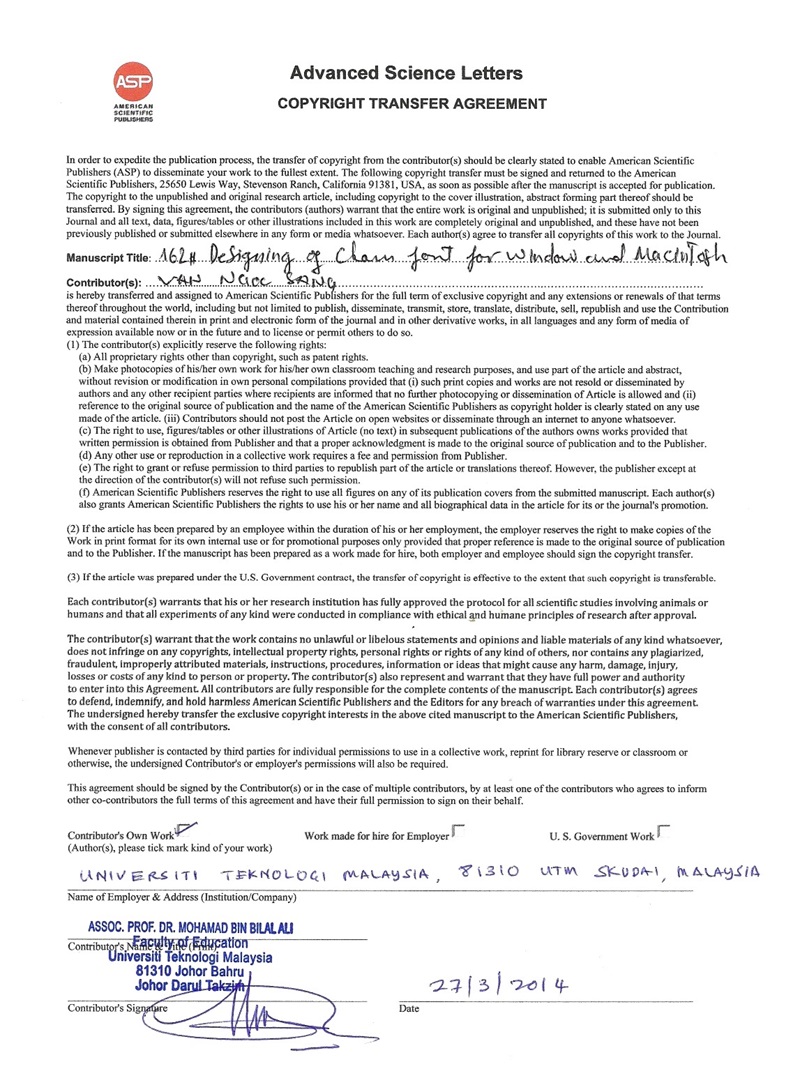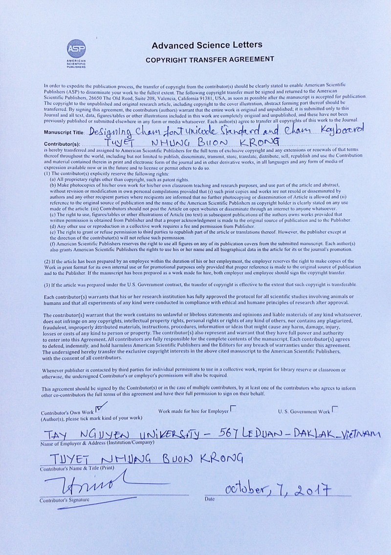 Hình 3. Bản quyền (Copyright),Van Ngoc Sang, Mohamad Bin Bilal Ali. Designing Cham Fonts for Windows and Macintosh. Advanced Science Letters, ISSN: 1936-6612 (Print): EISSN: 1936-7317. Vol. 20, No. 10-12 October 2014, pp. 1833- 1836 (4). [doi: http://dx.doi.org/10.1166/asl.2014.5639]. Publisher: American Scientific Publishers