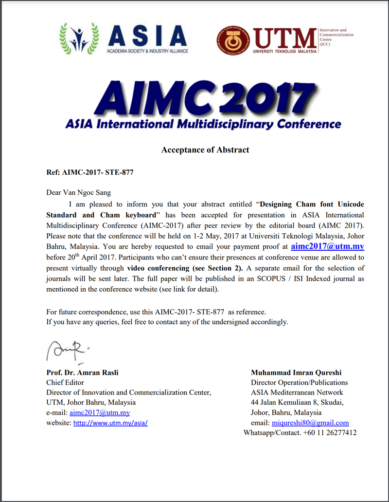 Hình 29. Acceptance of abstract (AIMC2017): Design Cham font Unicode Standard and Cham Keyboard