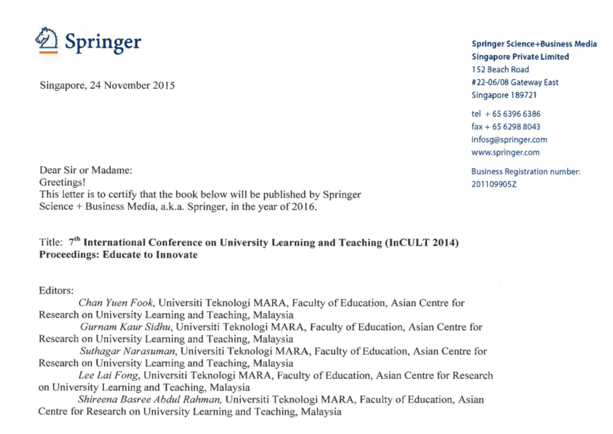 Hình 20. Van Ngoc Sang, Nguyen Thuy Van. “Student Perception of Using Project-Based Learning (PjBL): A Case Study in Universiti Teknologi Malaysia (UTM)”. The 7th International Conference on University Learning and Teaching (InCULT 2014). Proceedings: Educate to Innovate. ISBN: 978-981-287-663-8 (Print). ISBN: 978-981-287-664-5 (Online). Pp. 387-397, November 24, 2015. [DOI 10.1007/978-981-287-664-5_31]. Published by Springer. Singapore.