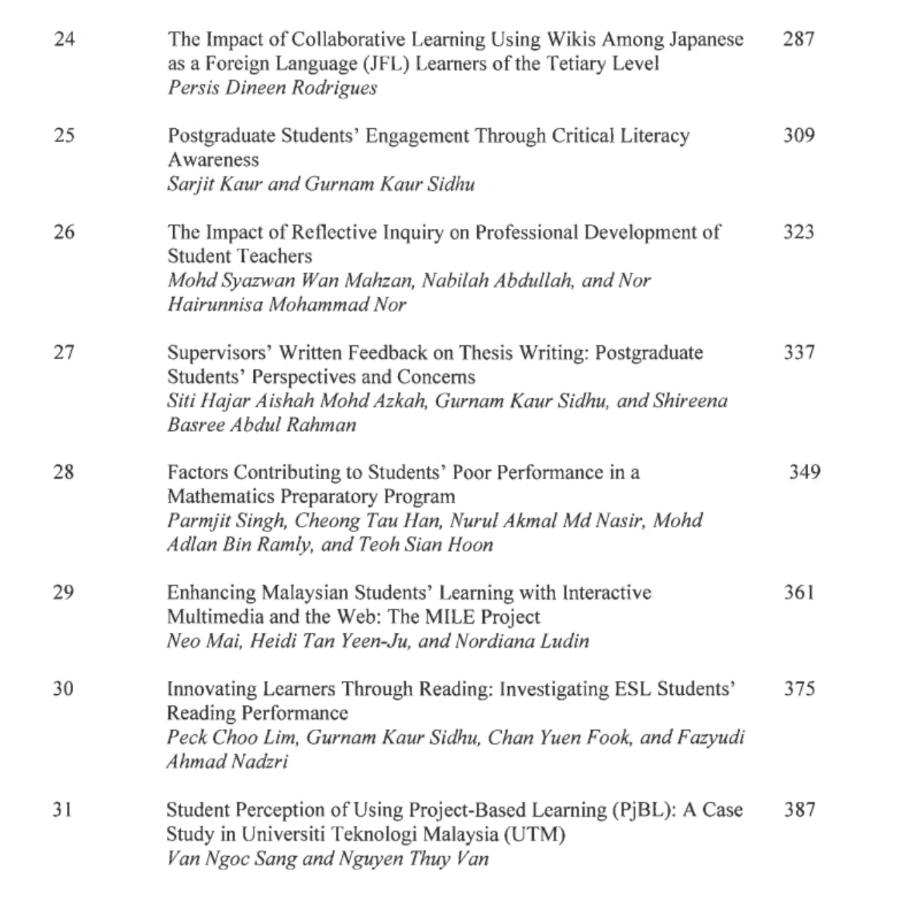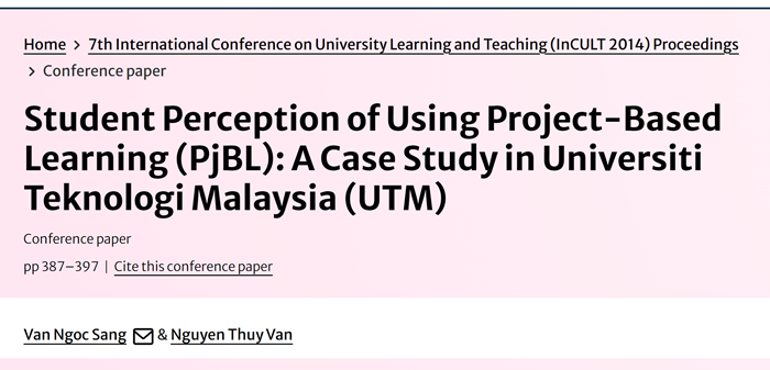 Van Ngoc Sang, Nguyen Thuy Van. “Student Perception of Using Project-Based Learning (PjBL): A Case Study in Universiti Teknologi Malaysia (UTM)”. The 7th International Conference on University Learning and Teaching (InCULT 2014). Proceedings: Educate to Innovate. ISBN: 978-981-287-663-8 (Print). ISBN: 978-981-287-664-5 (Online). Pp. 387-397, November 24, 2015. [DOI 10.1007/978-981-287-664-5_31]. Published by Springer. Singapore.