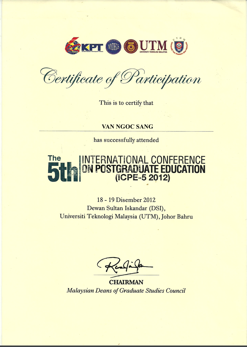 Hình 45. Van Ngoc Sang (Budi - Putra Podam), Certificate of “Design Rumi Champa 2000 via EFEO Cham Dictionary”. The 5th International Conference on Posgraduate Education (ICPE-5 2012). Malaysia, 18-19 December, 2012.