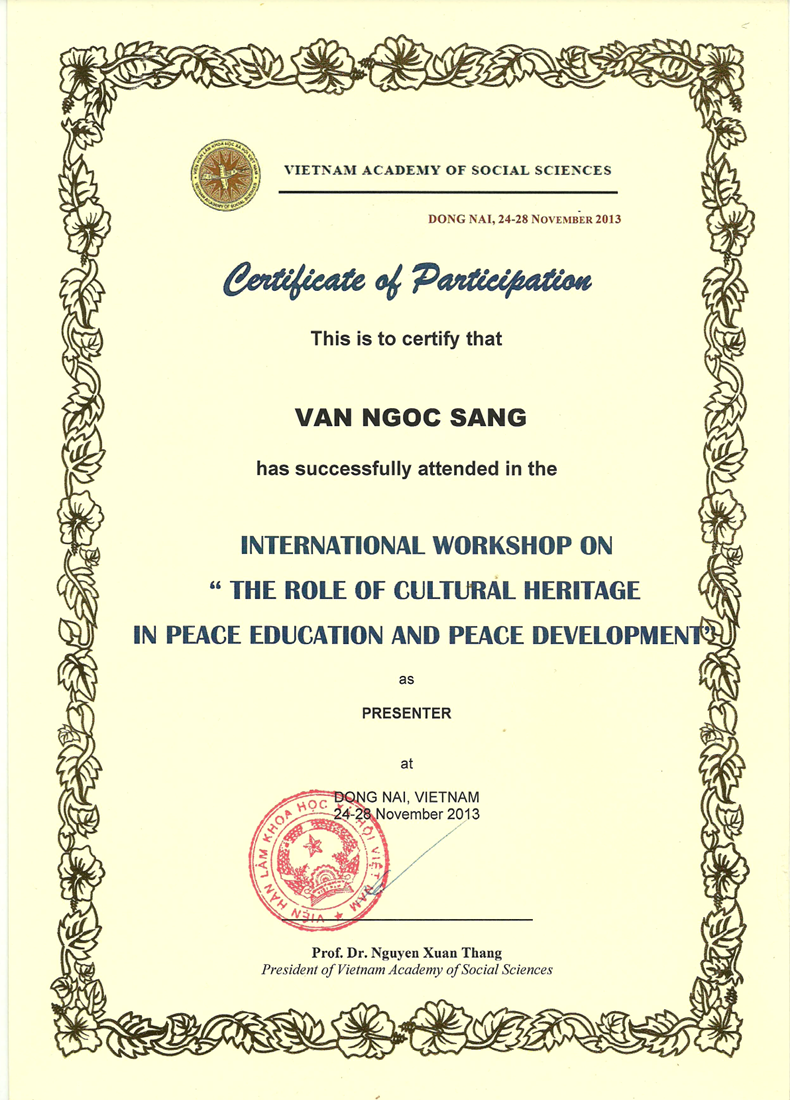 Van Ngoc Sang, Julie Nguyen. “The Role of Education in Solving the Conflict of Indigenous Heritage Preservation”. Proceeding of International Workshop on “The Role of Cultural Heritage in Peace Education and Peace Development”. Viet Nam, November 24-28, 2013.