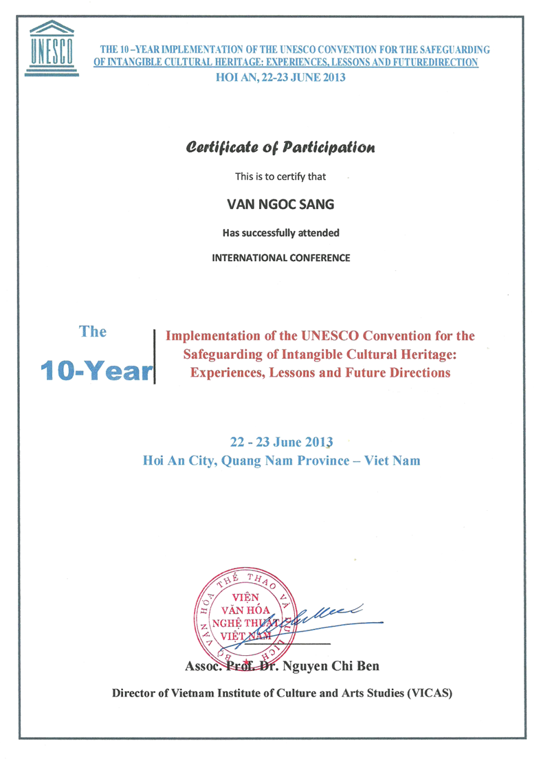 Hình 42. Van Ngoc Sang (Budi - Putra Podam), Certificate of International Conference on “The 10-Year Implementation of the UNESCO Convention for the Safeguarding of Intangible Cultural Heritage: Experiences, Lessons and Future Directions”. Viet Nam, June 22-23, 2013.