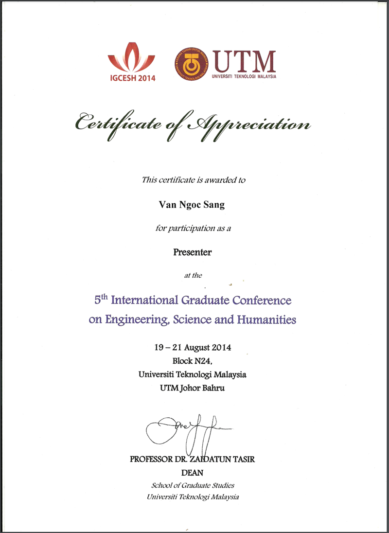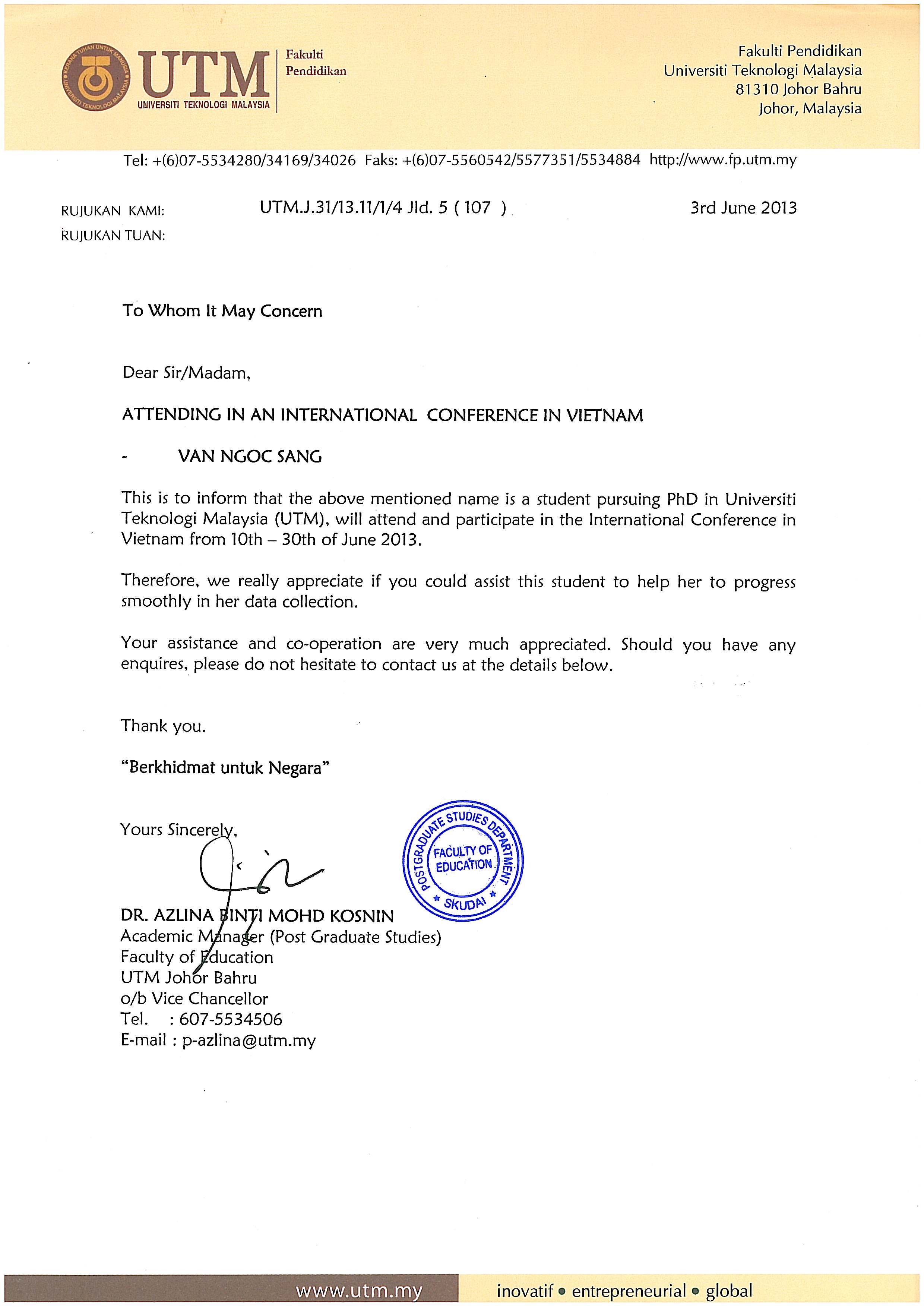 Letter Invitation: Van Ngoc Sang Phd student in UTM Malaysia
