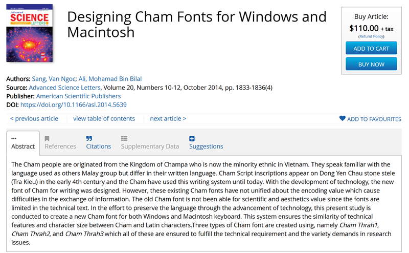 Hình 2. Van Ngoc Sang, "Designing Cham Fonts for Windows and Macintosh". Advanced Science Letters, ISSN: 1936-6612 (Print): EISSN: 1936-7317. Vol. 20, No. 10-12 October 2014, pp. 1833- 1836 (4). [doi: http://dx.doi.org/10.1166/asl.2014.5639]. Publisher: American Scientific Publishers. Tạp chí lúc mới đăng giá (price): $150, hiện nay giá (price): $110.