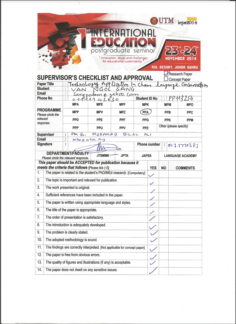 Van Ngoc Sang, Mohamad Bin Bilal Ali. “Technology Applications in Cham Language Conservation”. The 1st International Education Postgraduate Seminar (IEPS2014). Universiti Teknologi Malaysia (UTM). Malaysia, 23-24, November 2014.