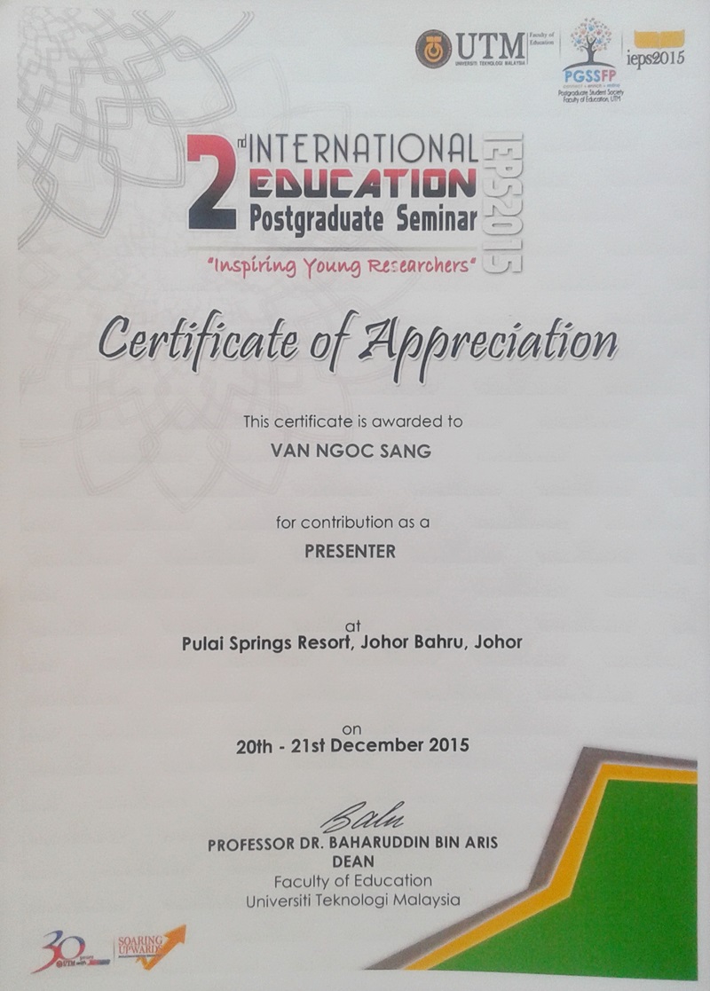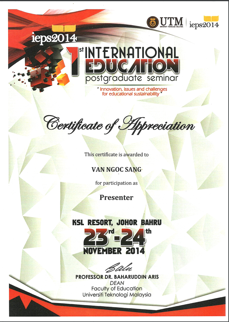 Hình 8. Van Ngoc Sang (Budi - Putra Podam), The 1st International Education Postgraduate Seminar (IEPS2014). Universiti Teknologi Malaysia (UTM). Malaysia, 23-24, November 2014.