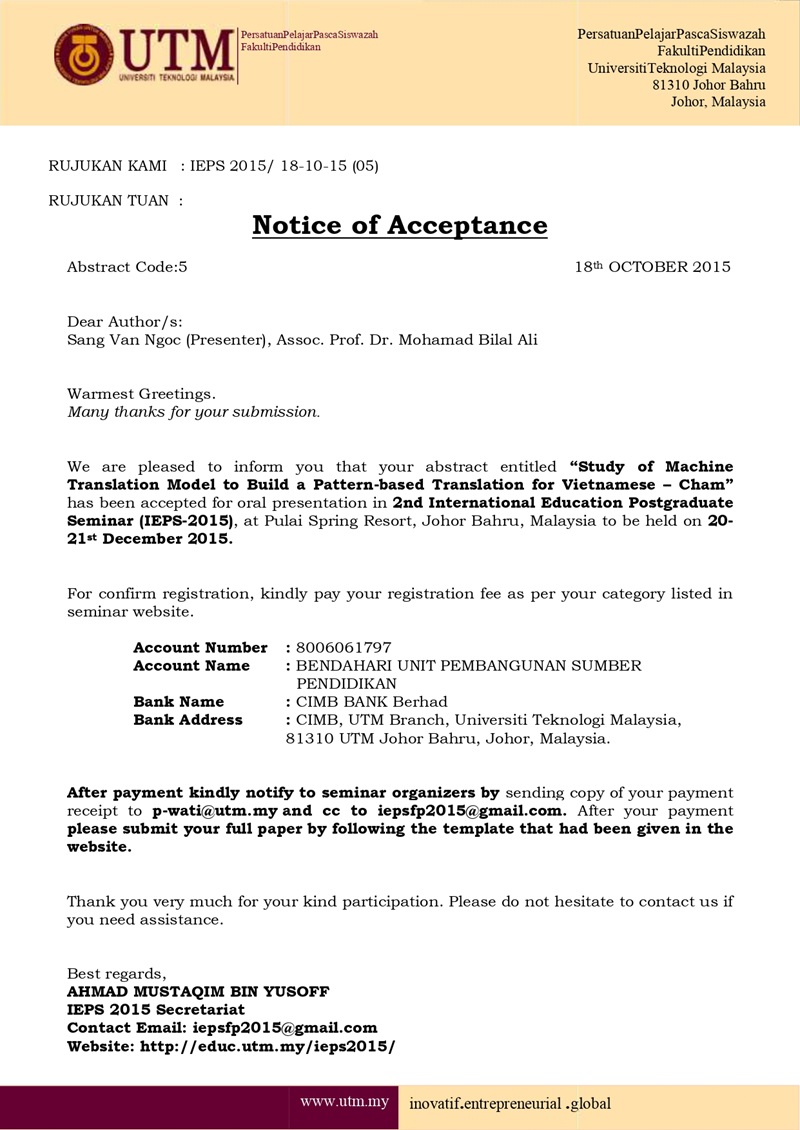 Hình 11. Letter of acceptance: "Study of Machine Translation to Build Pattern-based Model for Vietnamese – Cham". The 2nd International Education Postgraduate Seminar (IEPS2015). On Inspiring Young Researchers. Universiti Teknologi Malaysia (UTM). Malaysia, 20-21, December 2015.