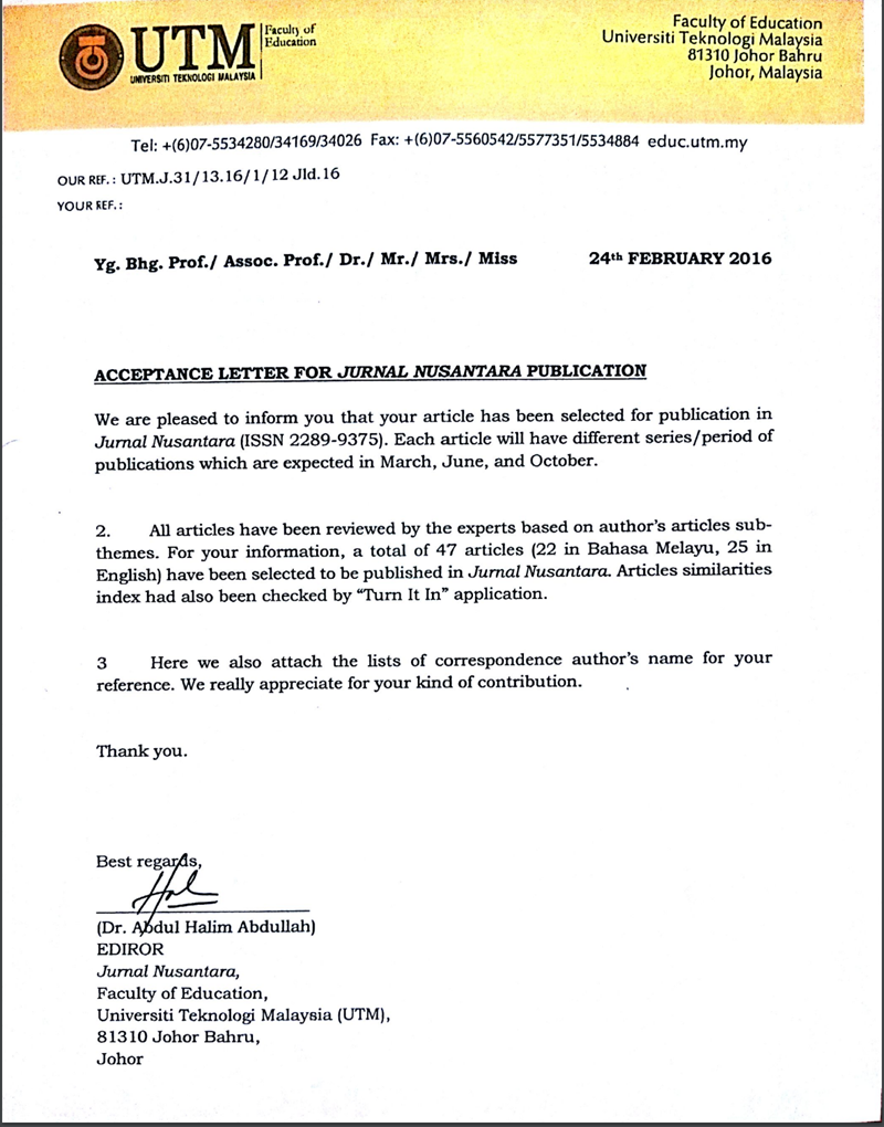 Acceptance Letter for Jurnal Nusantara Publication 2016: ISSN 2289 -9375. Published by Jurnal Pendidikan Nusantara.