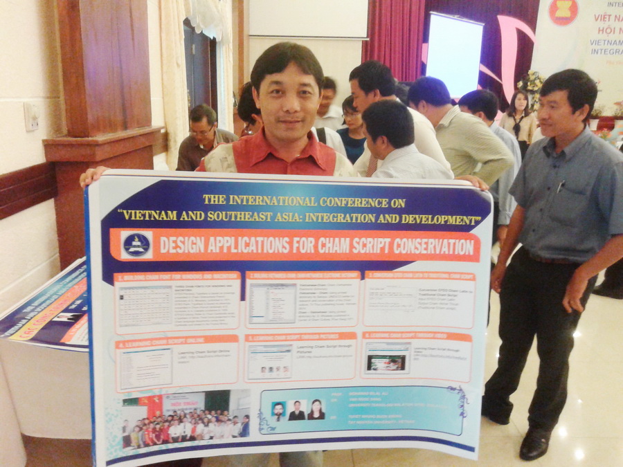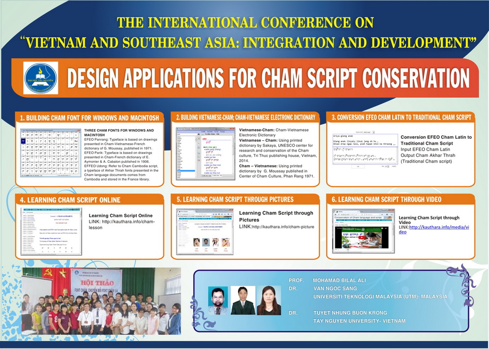 Van Ngoc Sang, Tuyet Nhung Buon Krong, Mohamad Bin Bilal Ali. "Preserving Cham script through online conservation application" (Bảo tồn chữ Cham qua ứng dụng chuyển tự Cham trực tuyến). The International Conferference: "Vietnam and Southeast Asia: Integration and Development" (Việt Nam và Đông Nam Á: Hội nhập và Phát triển). Tại Trung tâm Hội nghị Quốc tế Phú Yên - Việt Nam, December 5-6, 2015.