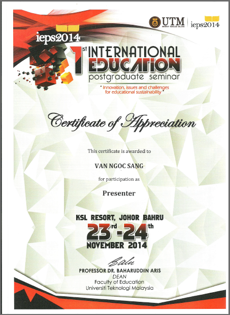 Van Ngoc Sang, Mohamad Bin Bilal Ali. Technology Applications in Cham Language Conservation. The 1st International Education Postgraduate Seminar (IEPS2014). Universiti Teknologi Malaysia (UTM). Malaysia, 23-24, November 2014.