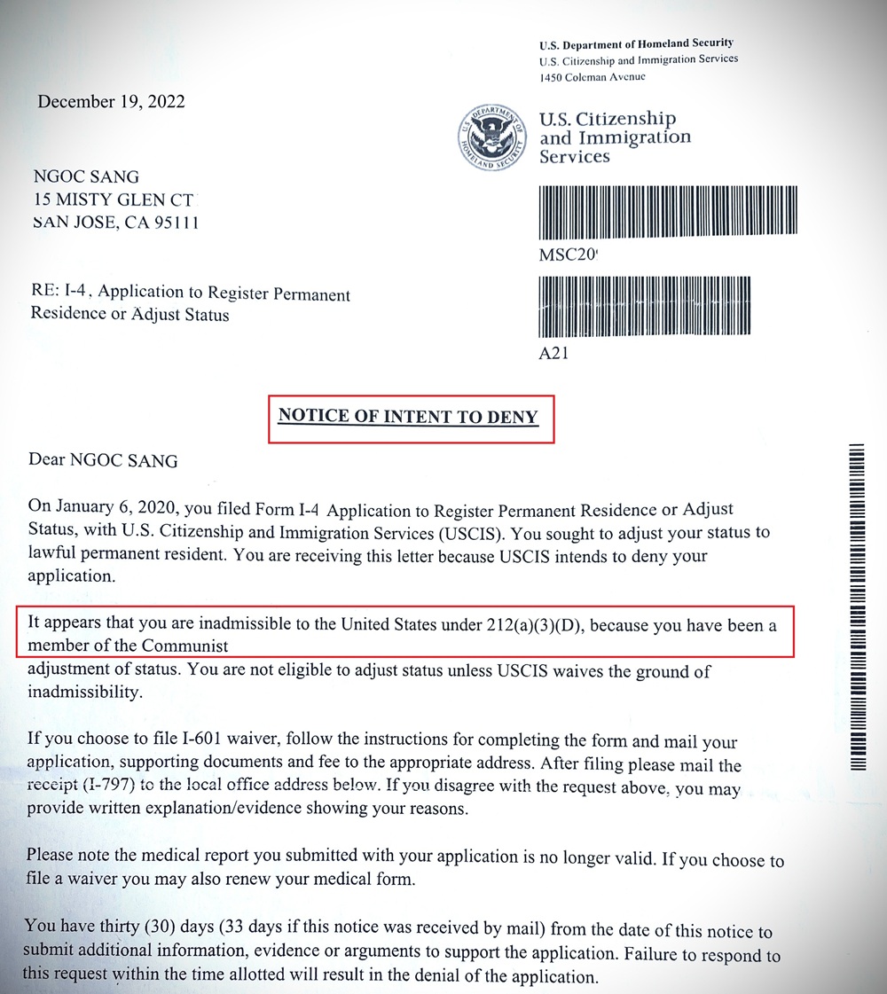 Hình 3. PhD.Putra Podam, nhận thư từ chối từ phía Sở Di trú Hoa Kỳ (Notice of intent to deny) được ghi 19/12/2022 (December 19, 2022), lý do hồ sơ còn liên quan "You have been a member of the Communist" (trong ô vuông màu đỏ). Nguồn: Putra Podam.